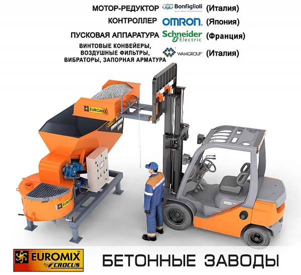 Краткое описание работы бетонного завода EUROMIX CROCUS 5/200 Мобильный бетонный завод EUROMIX CROCUS 5/200 производства ЗАВОДА EUROMIX предназначен для приготовления бетонов различных марок, согласно заданной рецептуры бетонной смеси, на основе цемента, инертных заполнителей, воды и жидких добавок.