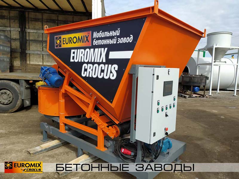 В Петрозаводск произведена отгрузка мобильного бетонного мини-завода EUROMIX CROCUS 8/300. Дополнительно в комплект оборудования входит станция растаривания СР-500Э, ковш для погрузчика и винтовой конвейер.