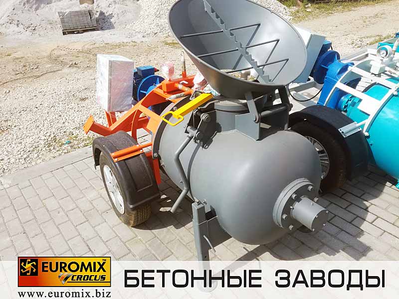 Для производства полусухой стяжки пола в многоквартирных домах отгружен смеситель-пневмонагнетатель EUROMIX 300 F TRAIL. Отличительной особенностью данной модели является наличие скипового подъемника, что позволяет увеличить производительность на 25-30%. Преимущество ковша-питателя заключается в том, что он дает возможность подготовки нового замеса в питателе в то время, когда идет транспортировка.